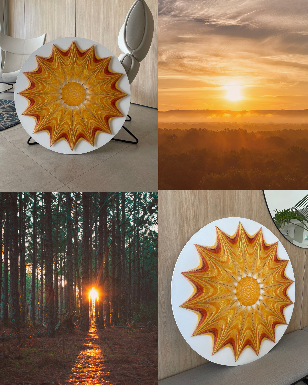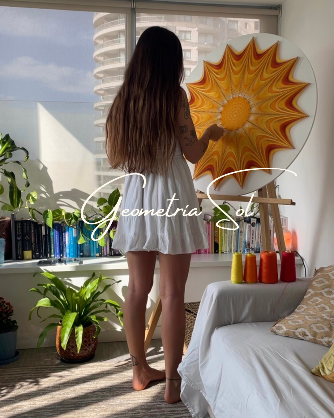 Así como el Sol ilumina todo lo que toca, esta geometría acompaña el proceso de iluminar tus pensamientos, tus decisiones y tu camino. Su forma representa la capacidad de proyectar tu energía hacia afuera, influir positivamente en tu entorno y recordar que tu brillo no depende de nada externo, sino que nace desde adentro. Crear esta obra es un acto simbólico de reconexión con tu poder personal y con tu capacidad de ser fuente de vida, claridad e inspiración.
